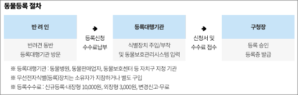 - 구청 동물등록대행기관 방문 또는 온라인 신청( ‘정부 24’ 및 ‘국가동물보호정보시스템’)