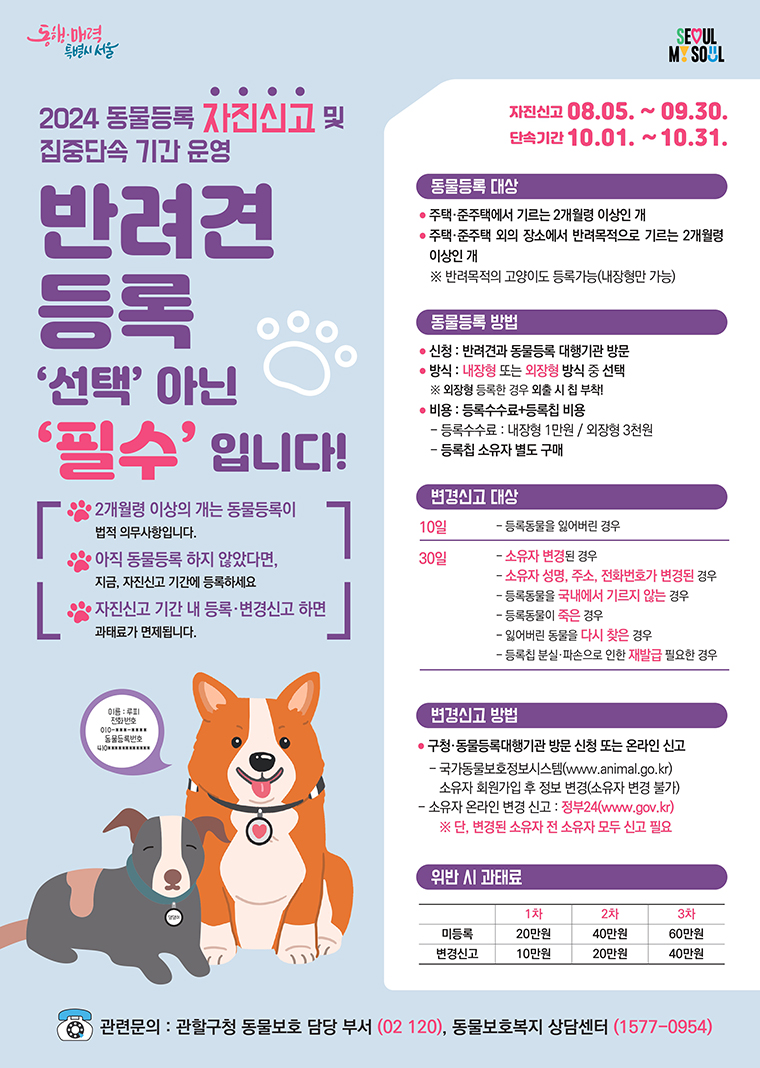 서울시는 2024년 8월 5일부터 9월 30일까지 반려동물등록 자진신고 기간을 운영하고 있습니다. 이 기간 동안 미등록된 반려견, 반려묘를 등록하거나, 이미 등록된 반려동물의 변경사항을 신고하면 과태료가 면제됩니다. 이후 10월 1일부터 10월 31일까지는 집중단속 기간으로, 이 기간에 등록되지 않은 반려동물의 경우 과태료가 부과됩니다.